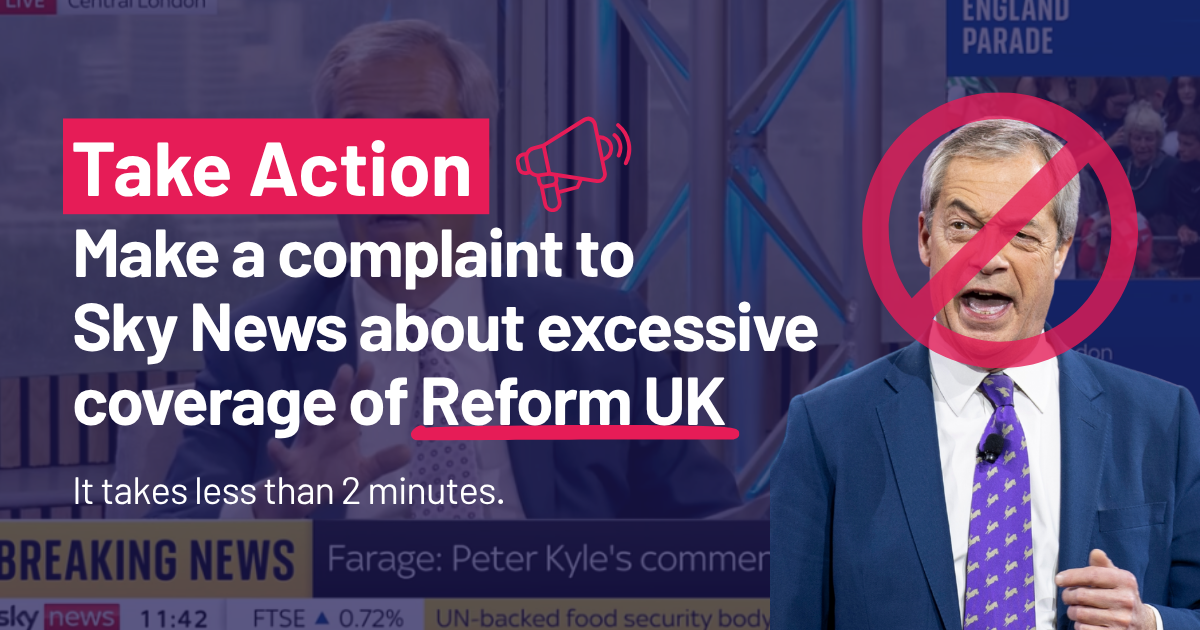 UPDATE 4th August, 2025: In the week since we launched this campaign, over 6000 of you have written to Sky News to complain. Thanks to your efforts, at yet another Reform UK press conference earlier today, Sky News chose to exercise greater editorial control over what they aired, instead of simply broadcasting the live feed from Reform UK. We welcome this change - but will continue to monitor coverage, and we will take further action if needed.
