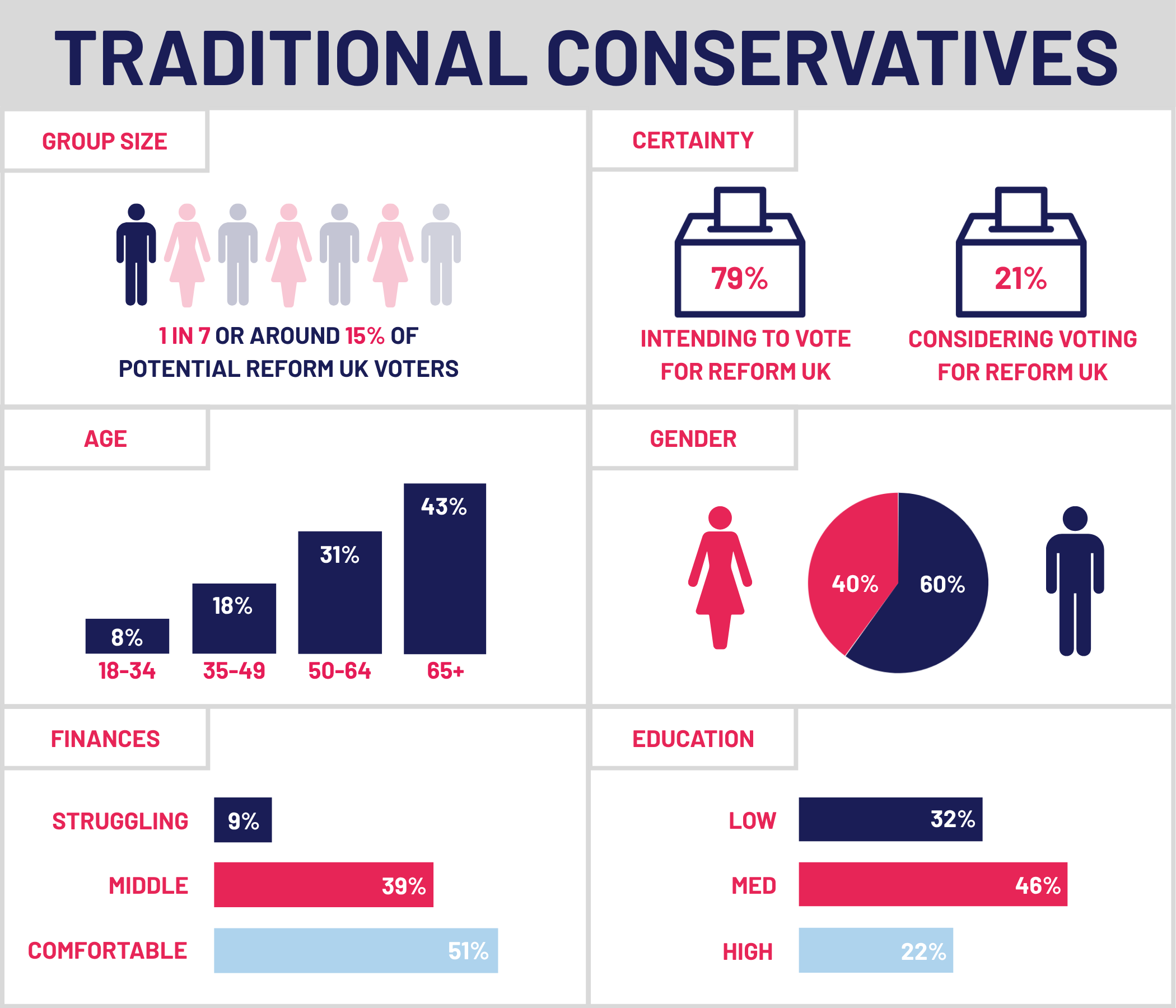 The findings revealed five distinct groups of voters among Reform UK voters. Among these groups, it is the Melancholy Middle and Civic Pragmatics who are most likely to be persuaded to vote for another party and who are relatively more progressive in their views. Unsurprisingly, the findings suggest that the Conservatives could also draw support from the Traditional Conservatives group.