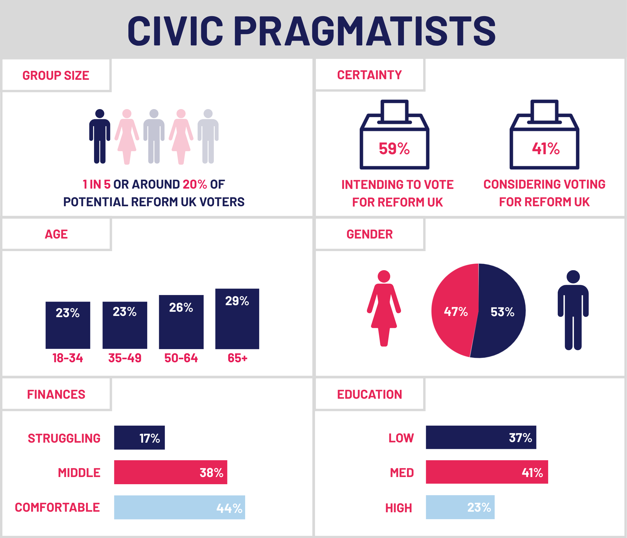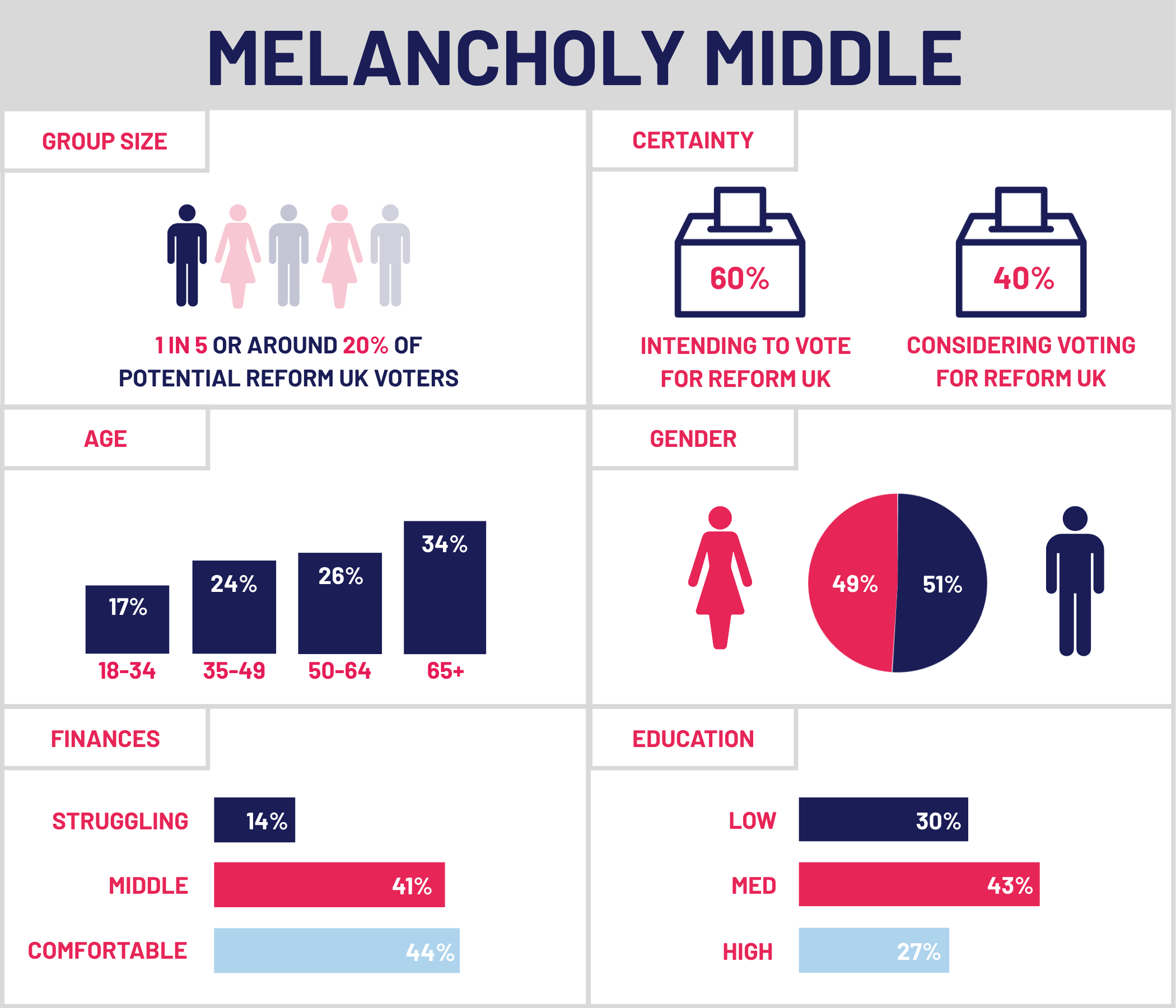 Although all of these groups are considering voting Reform UK in the next General Election, analysis suggests the final two of these five groups (Melancholy Middle and Civic Pragmatists), representing 40% of all people considering voting Reform UK, are more likely to be convinced not to do so: